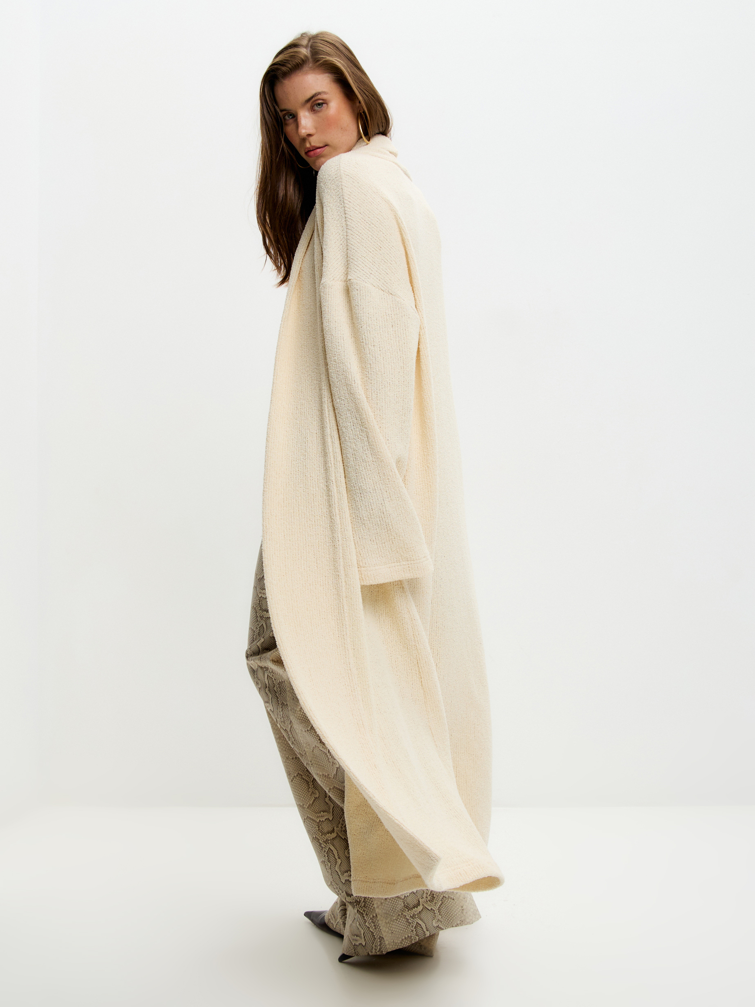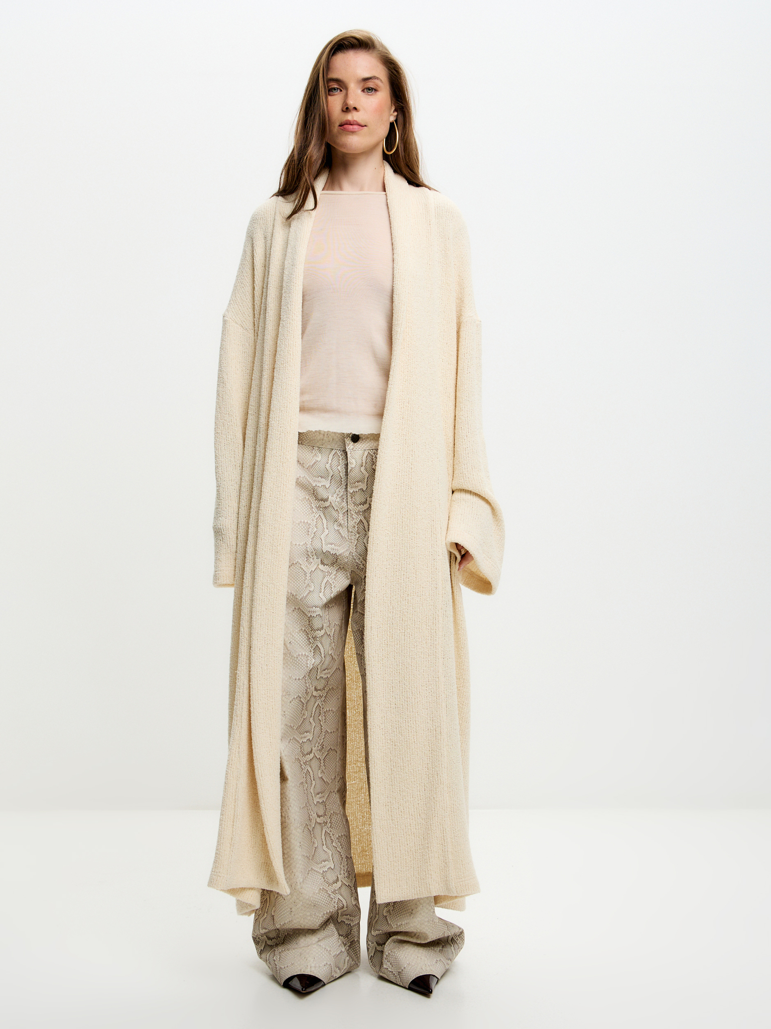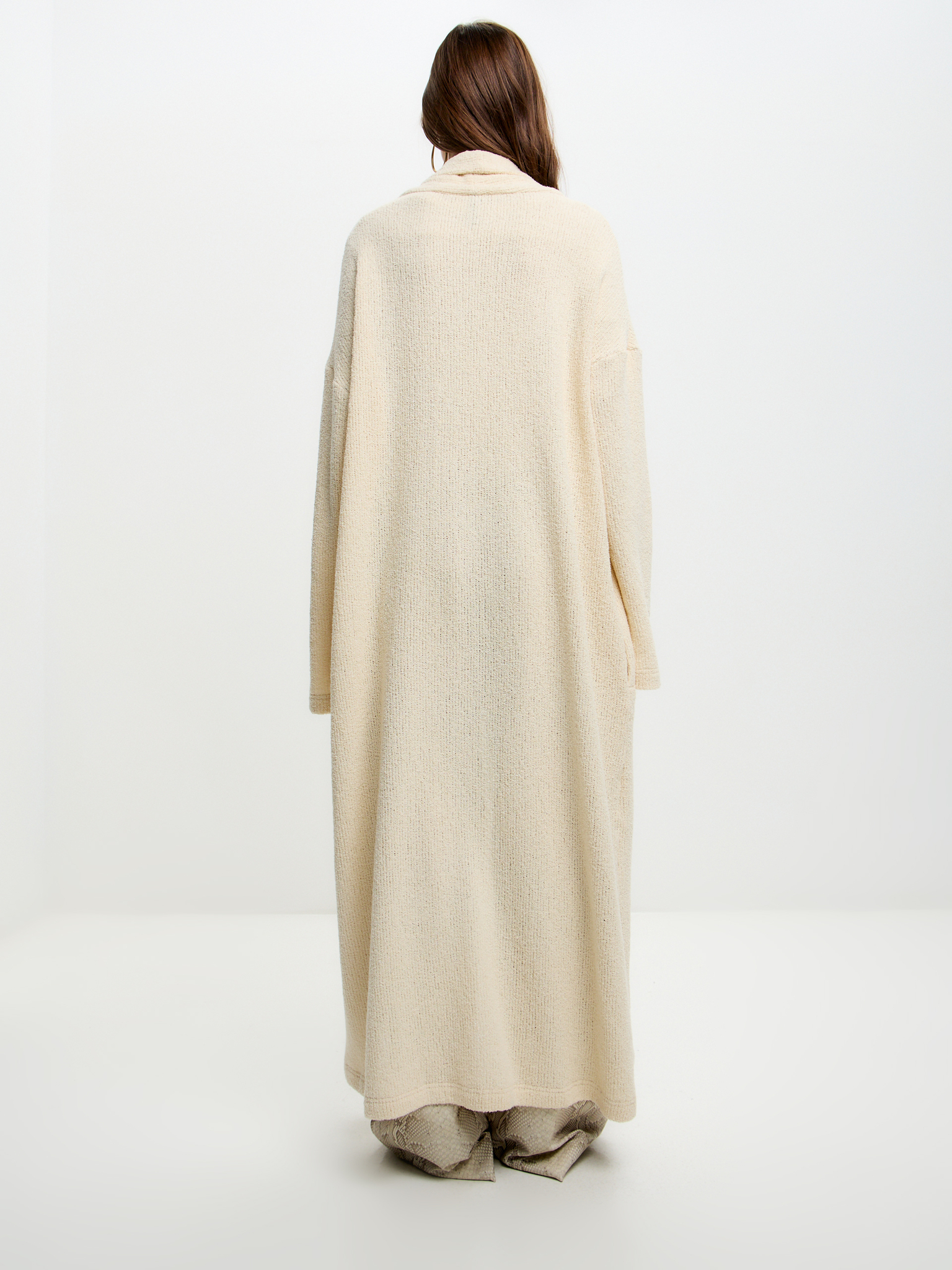 Сливочный кардиган из лёгкого зернистого трикотажа с эффектом «спущенного плеча» и длиной в пол. Мягкая, воздушная текстура придаёт образу утончённость и чувственность, для самых расслабленных и непринужденных образов.