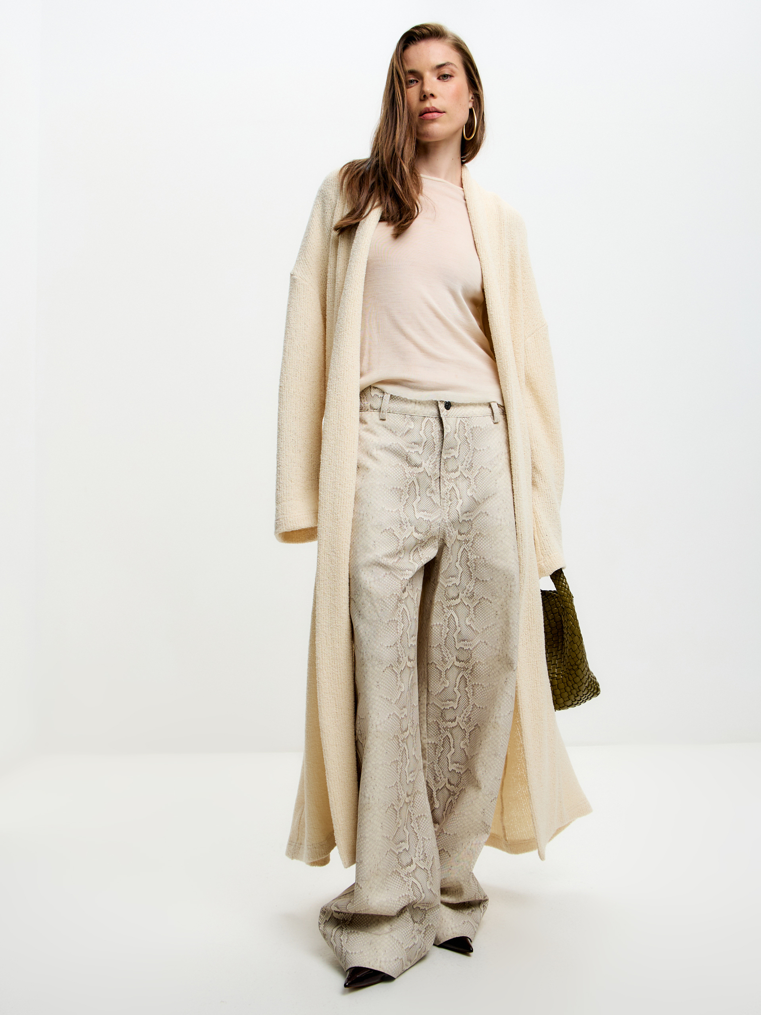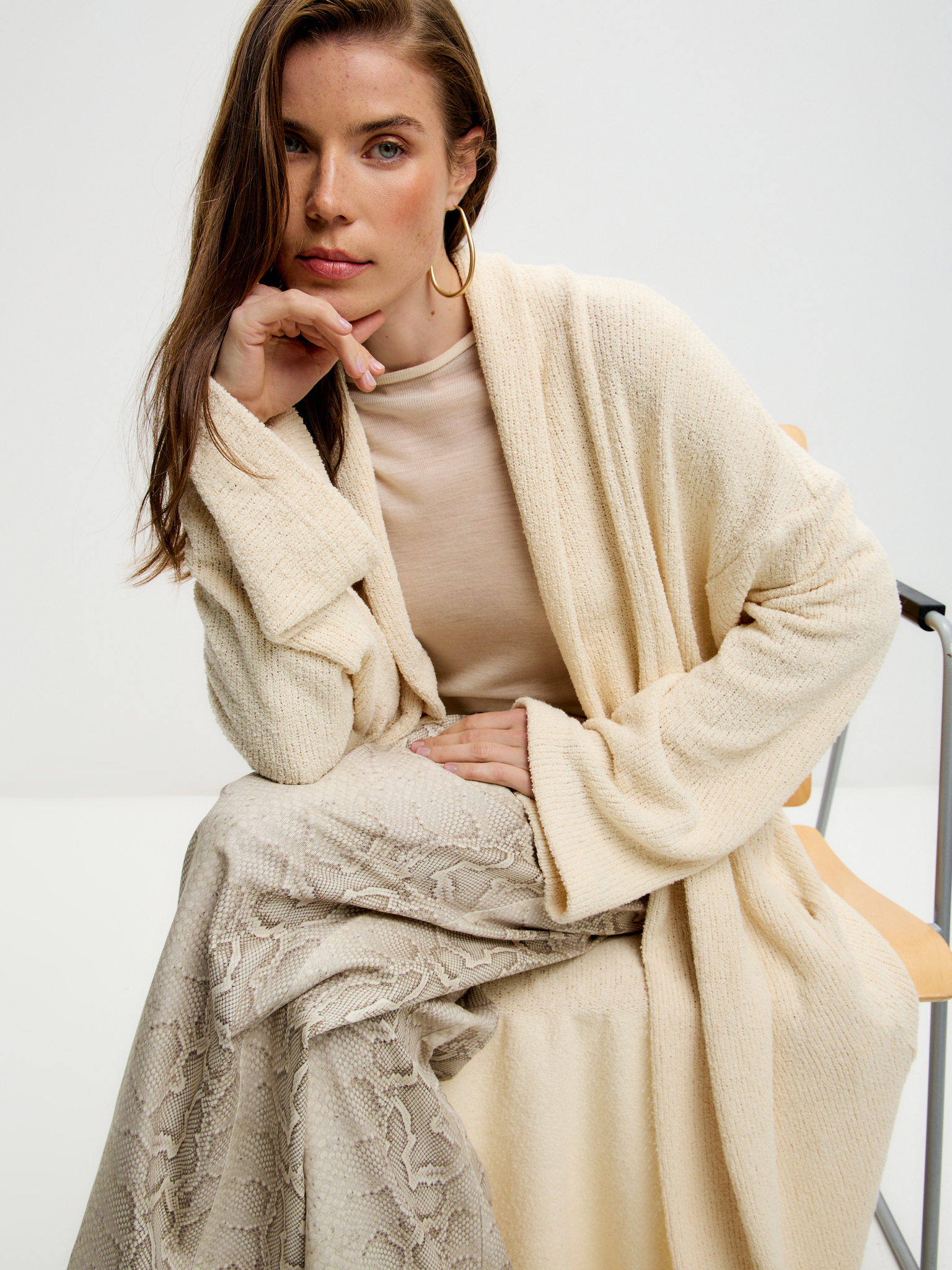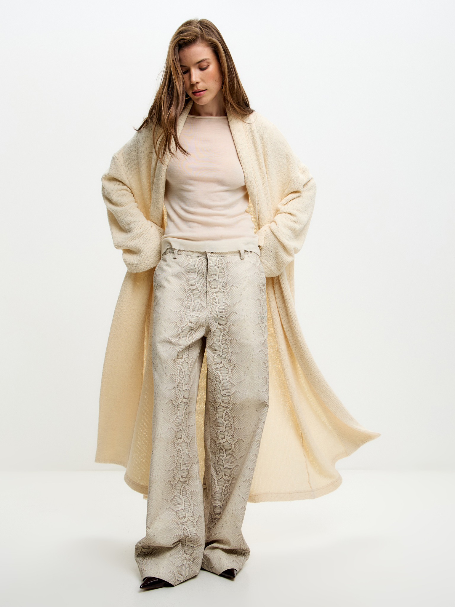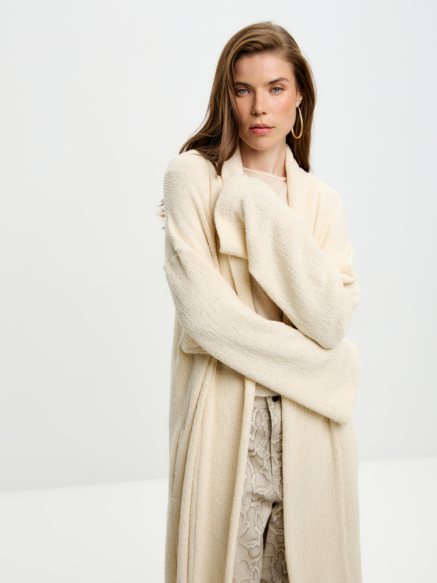 Сливочный кардиган из лёгкого зернистого трикотажа с эффектом «спущенного плеча» и длиной в пол. Мягкая, воздушная текстура придаёт образу утончённость и чувственность, для самых расслабленных и непринужденных образов.