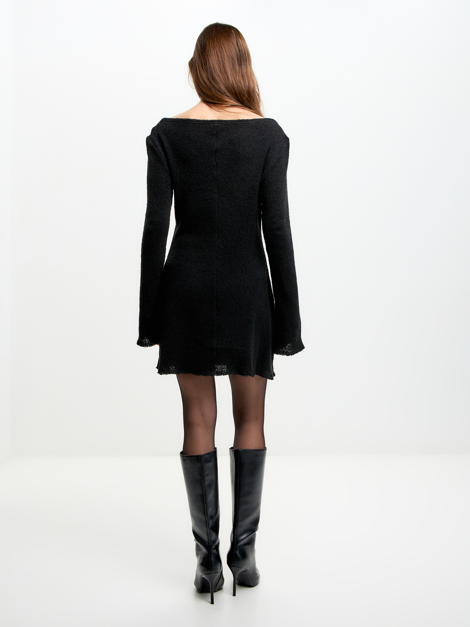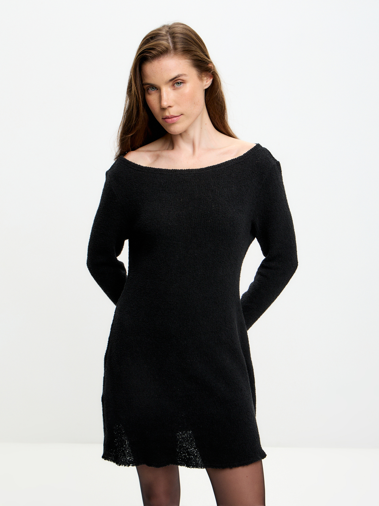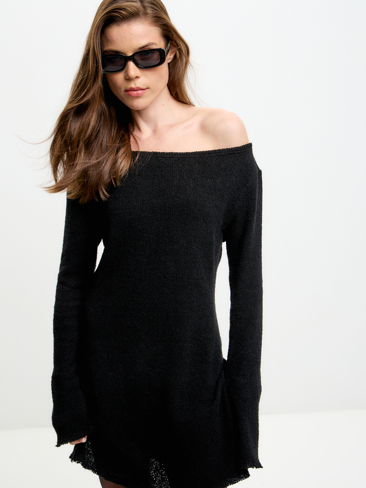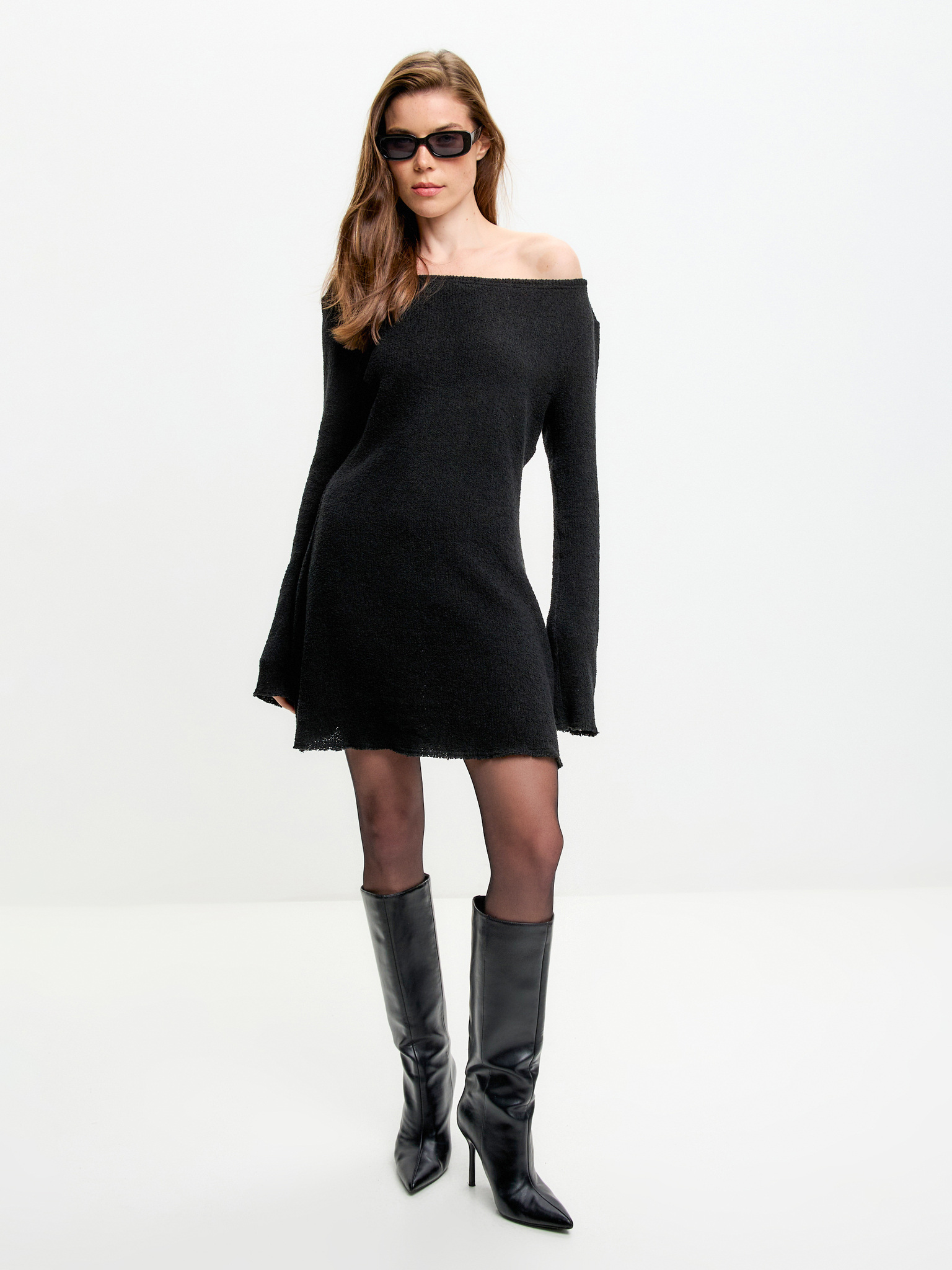 Мини-платье с длинным рукавом и спущенным плечом, чёрный. Зернистый трикотаж, приталенный крой — дерзко и прямо.