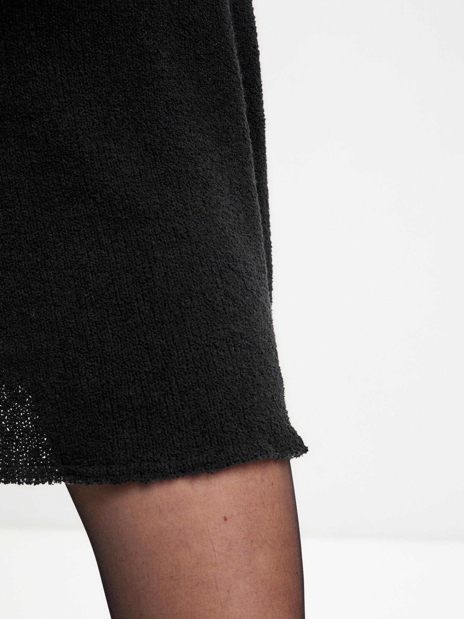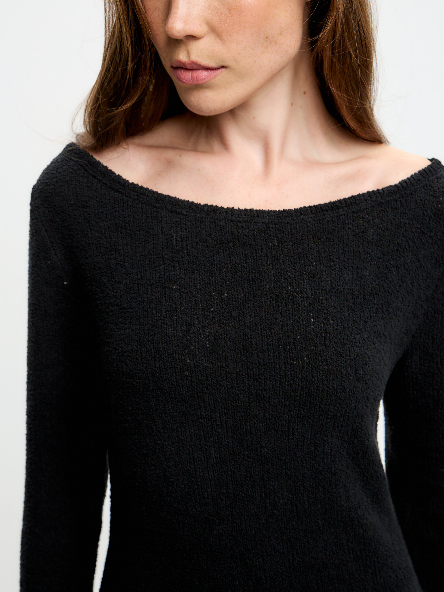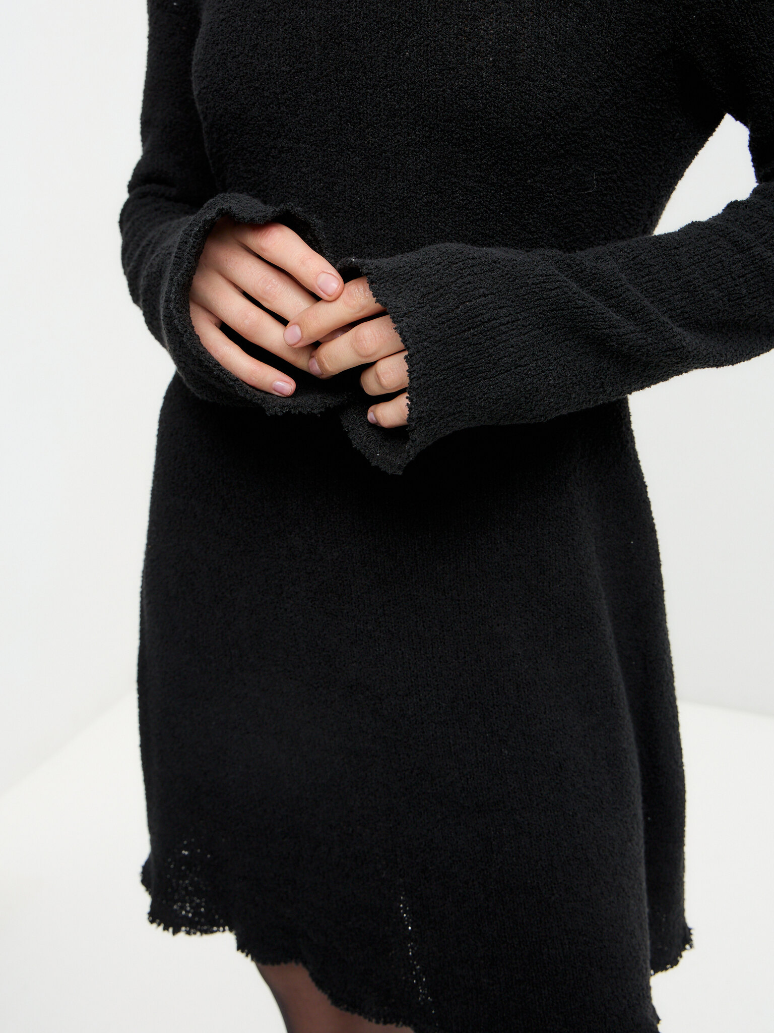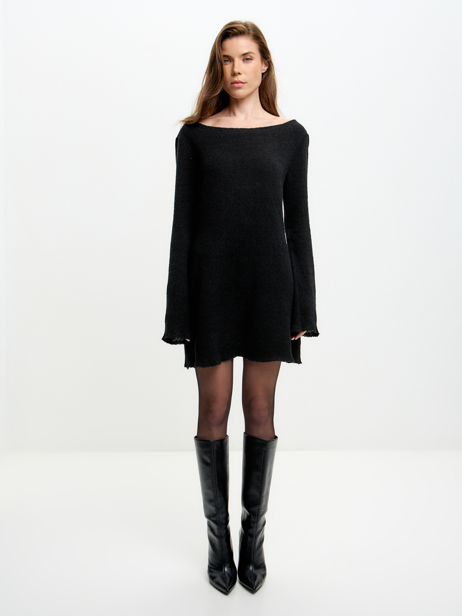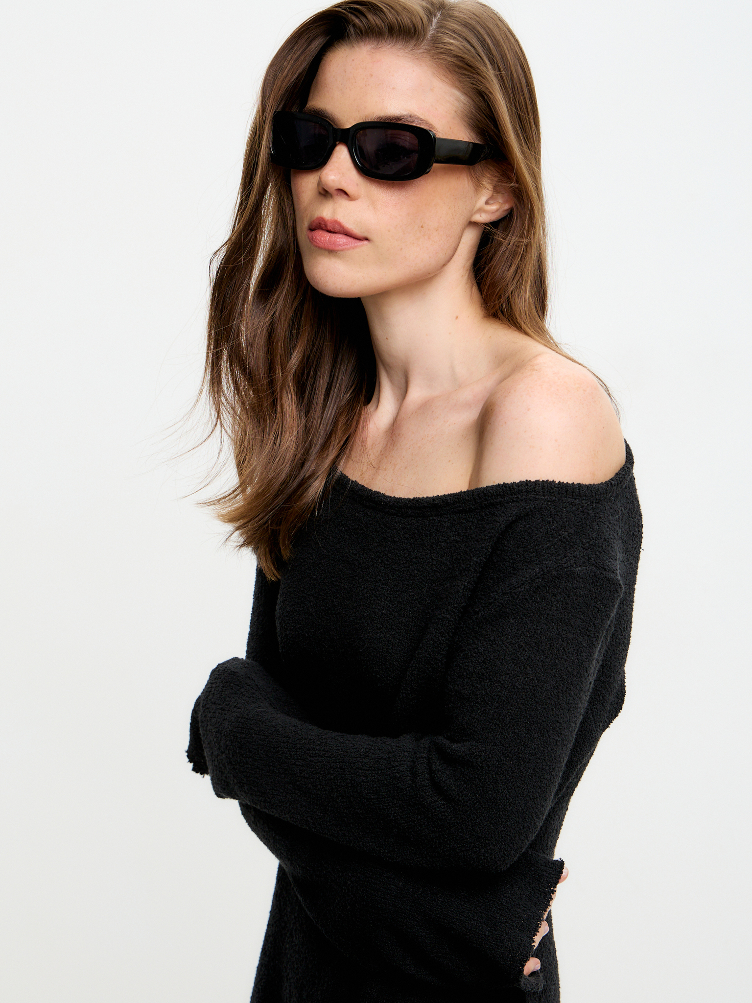 Мини-платье с длинным рукавом и спущенным плечом, чёрный. Зернистый трикотаж, приталенный крой — дерзко и прямо.