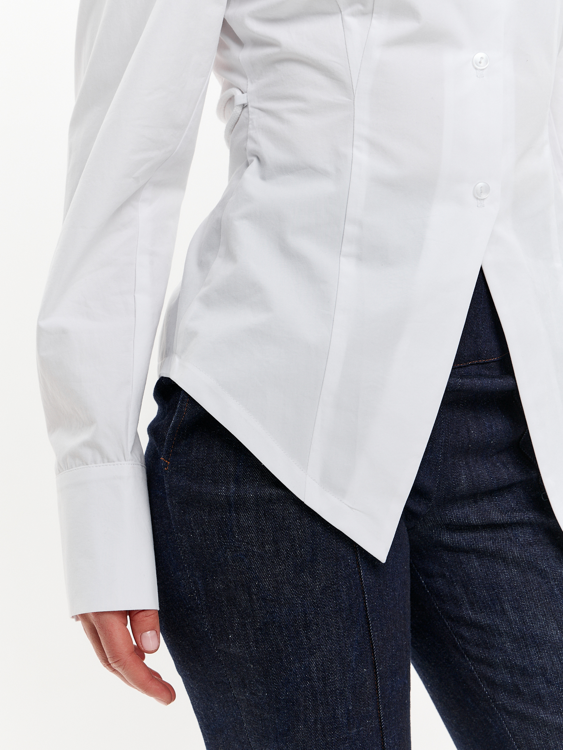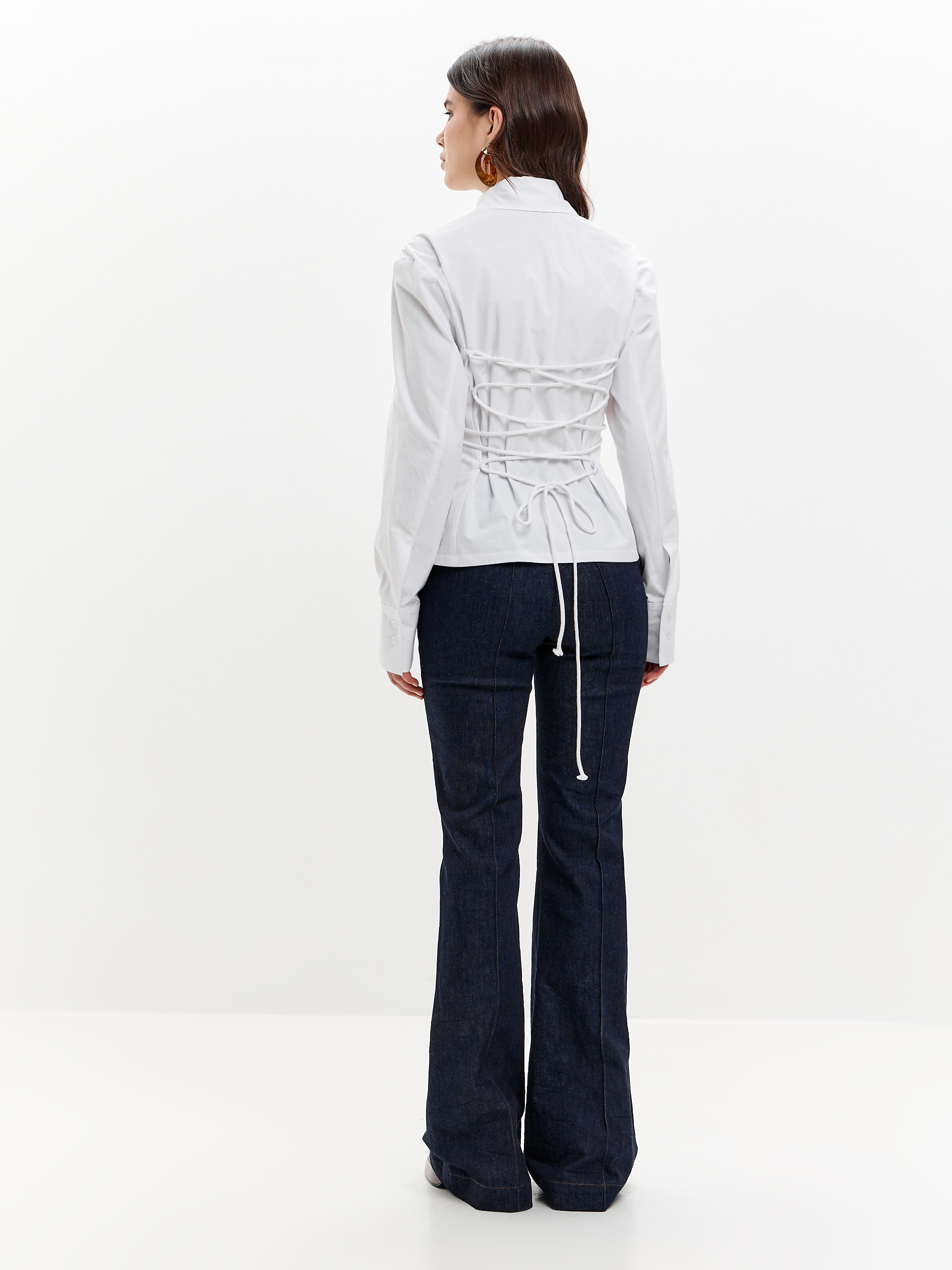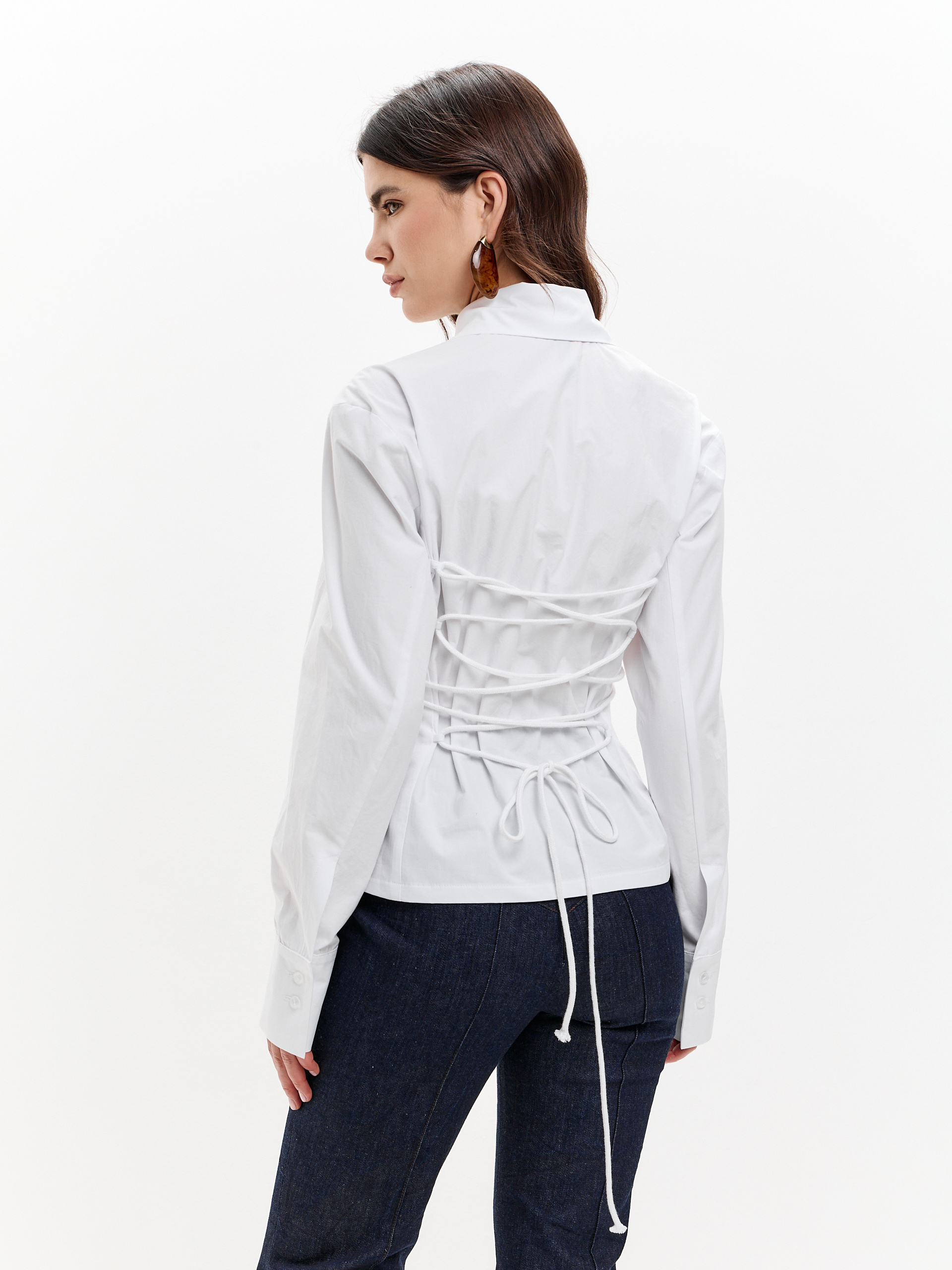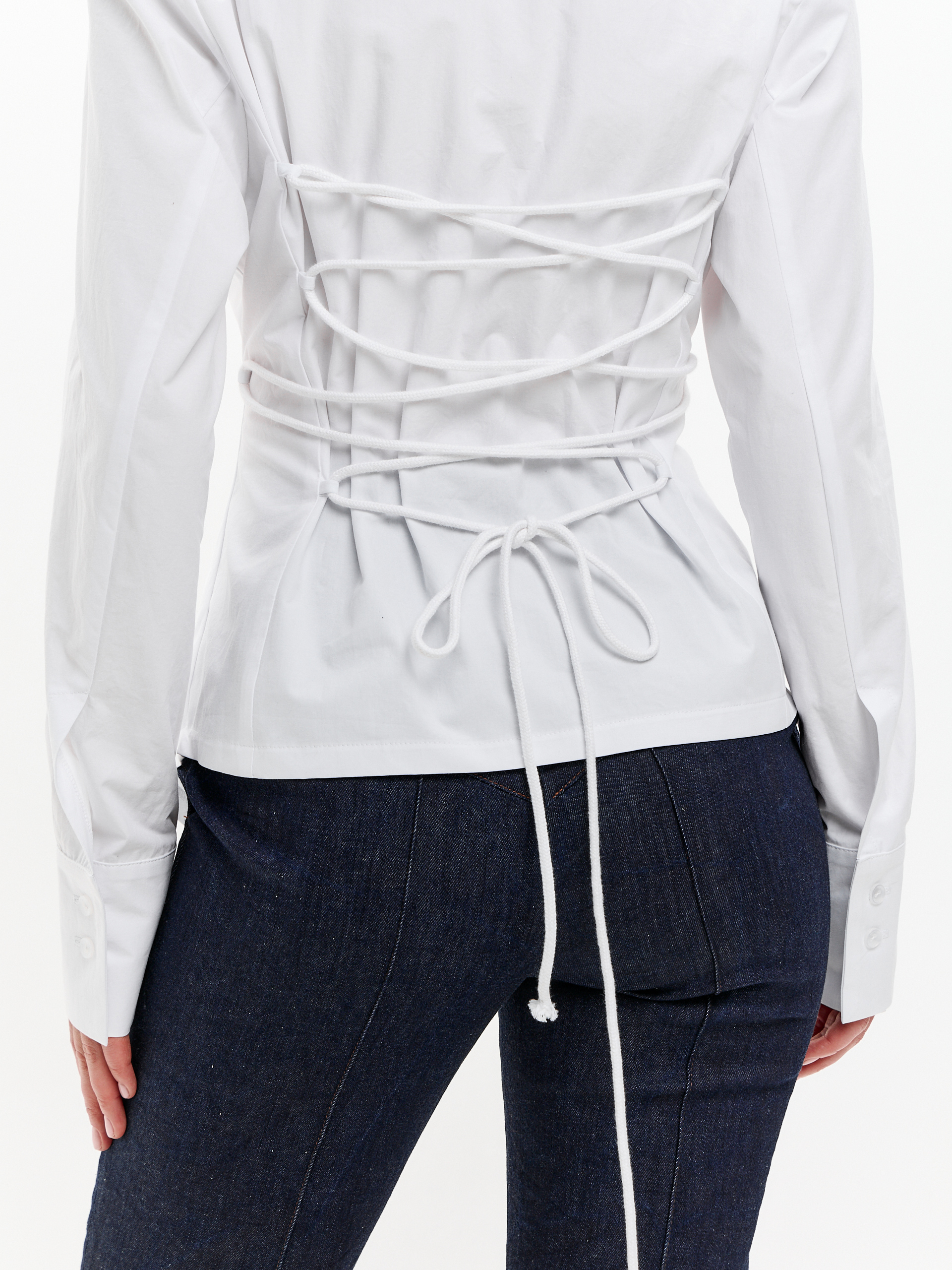 Рубашка из плотного хлопка, приталенная, с регулируемой шнуровкой на спине. Чуть расширенная линия плеча, фигурный низ.