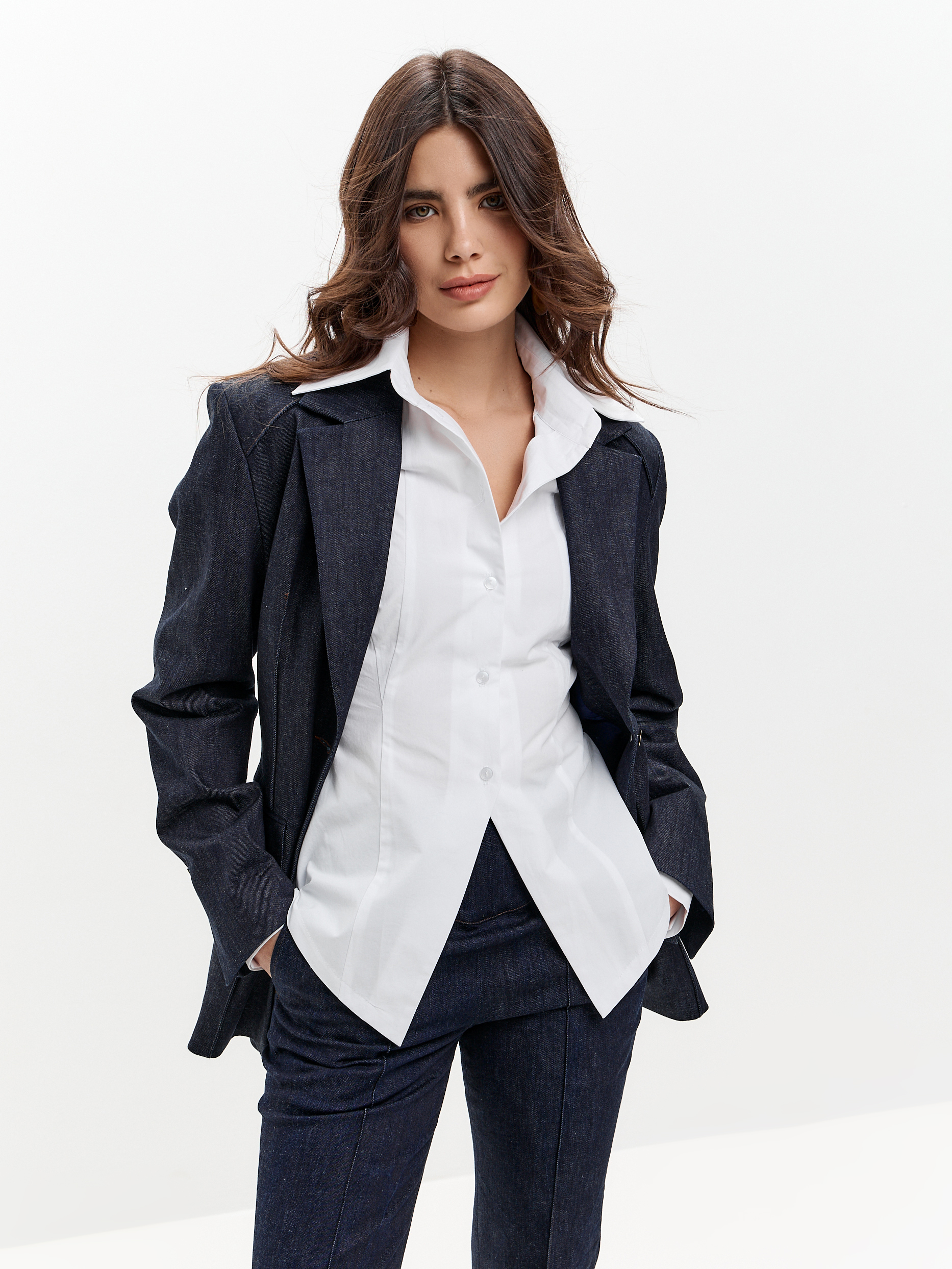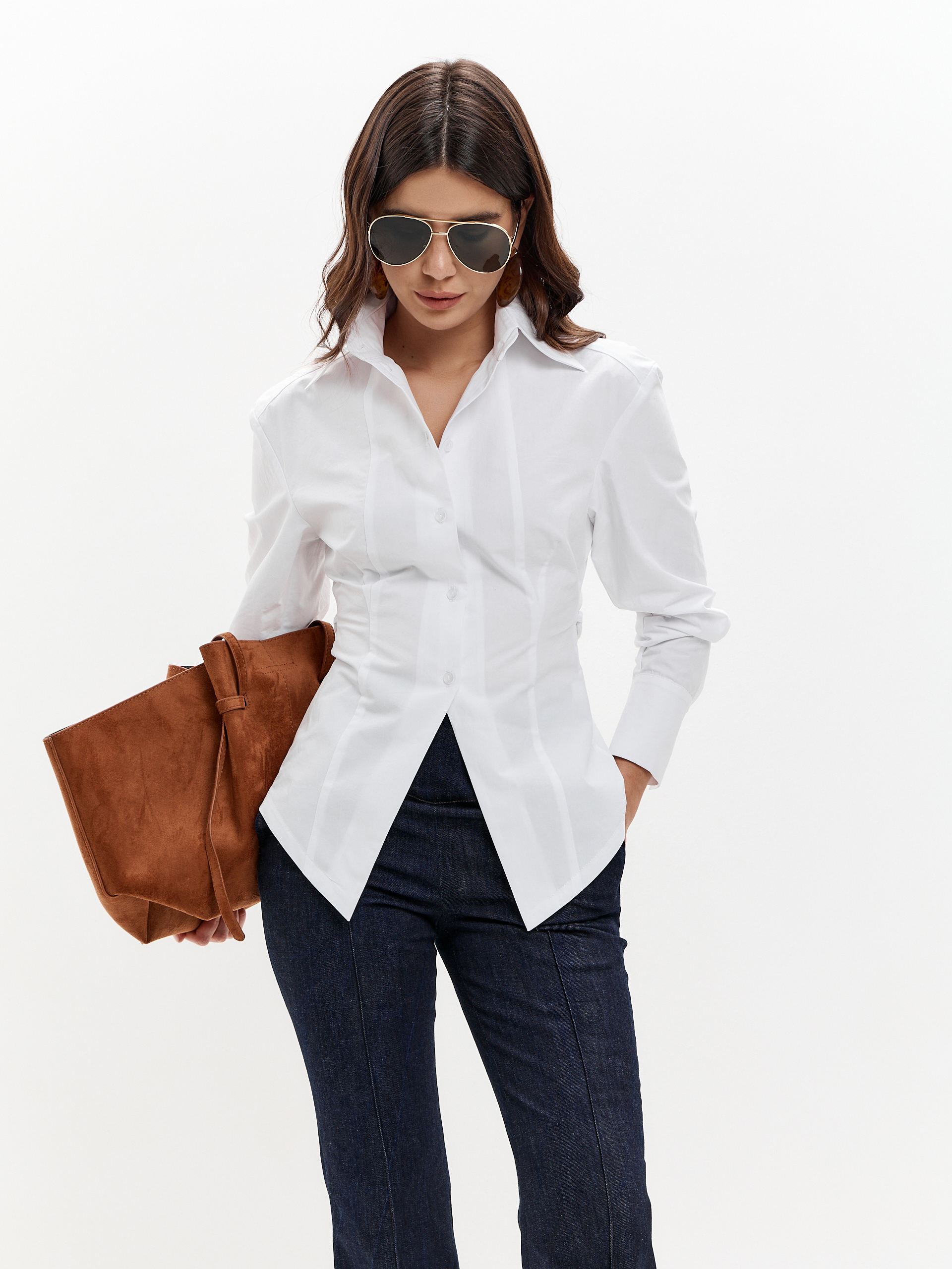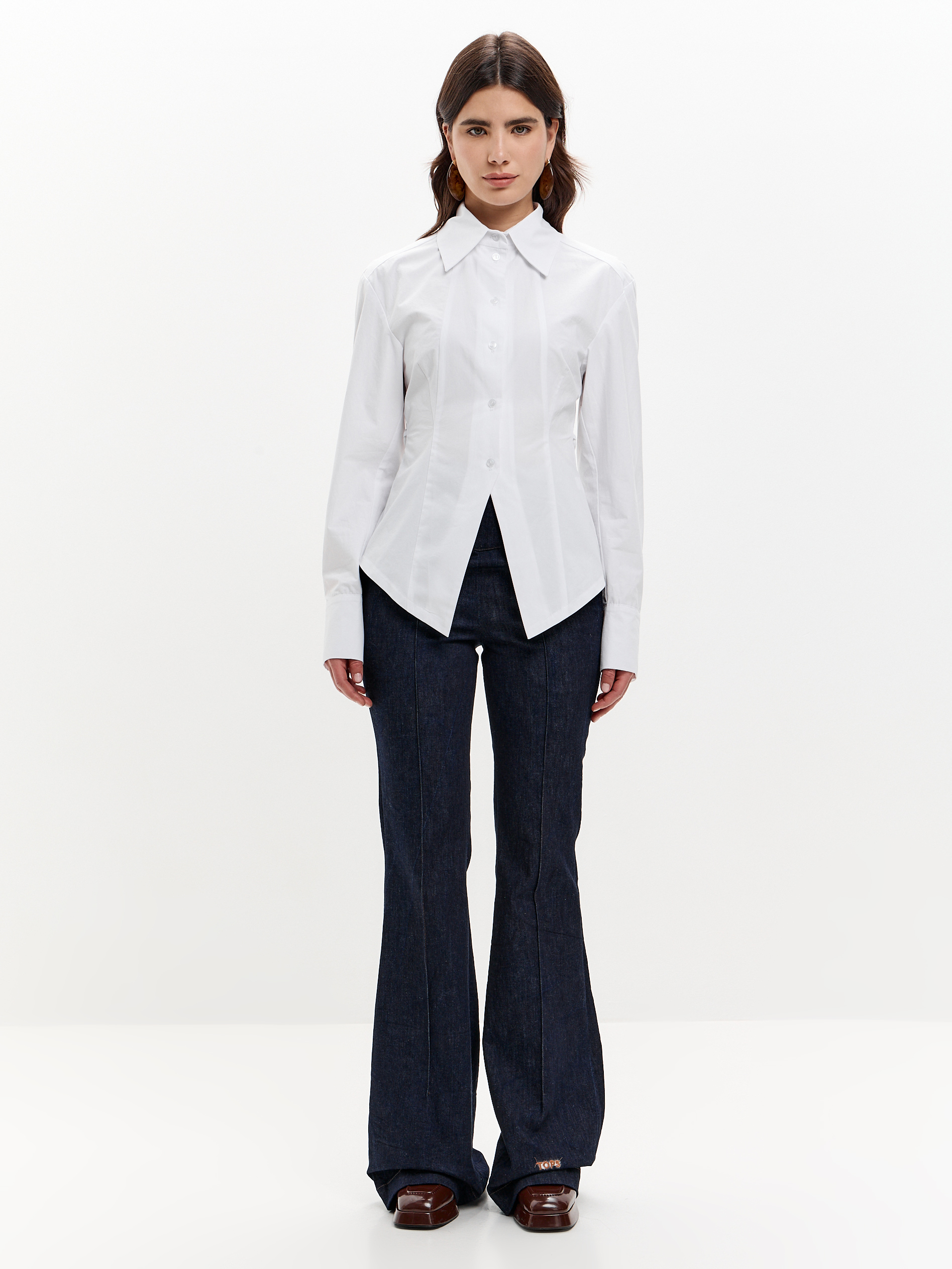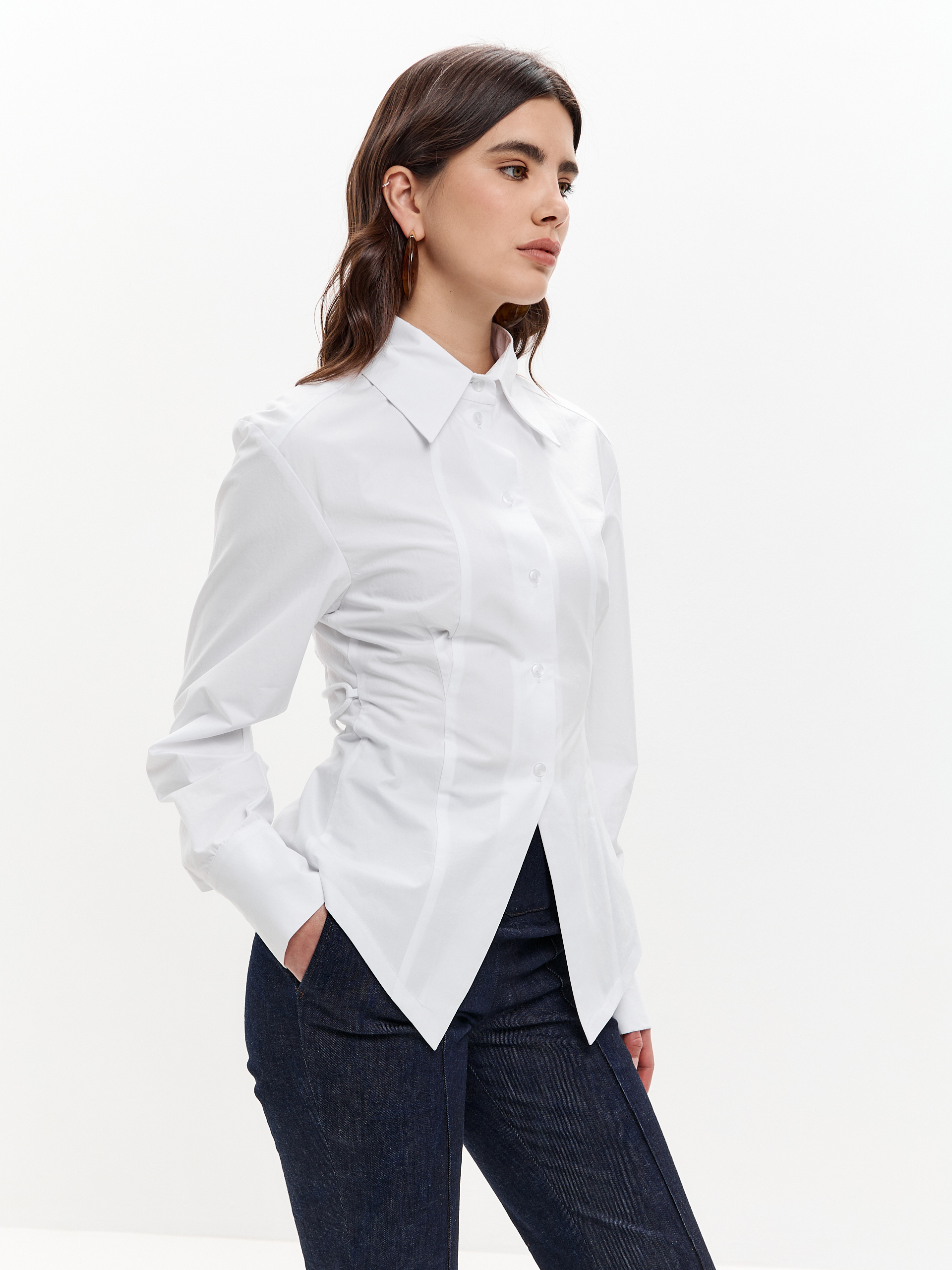 Рубашка из плотного хлопка, приталенная, с регулируемой шнуровкой на спине. Чуть расширенная линия плеча, фигурный низ.